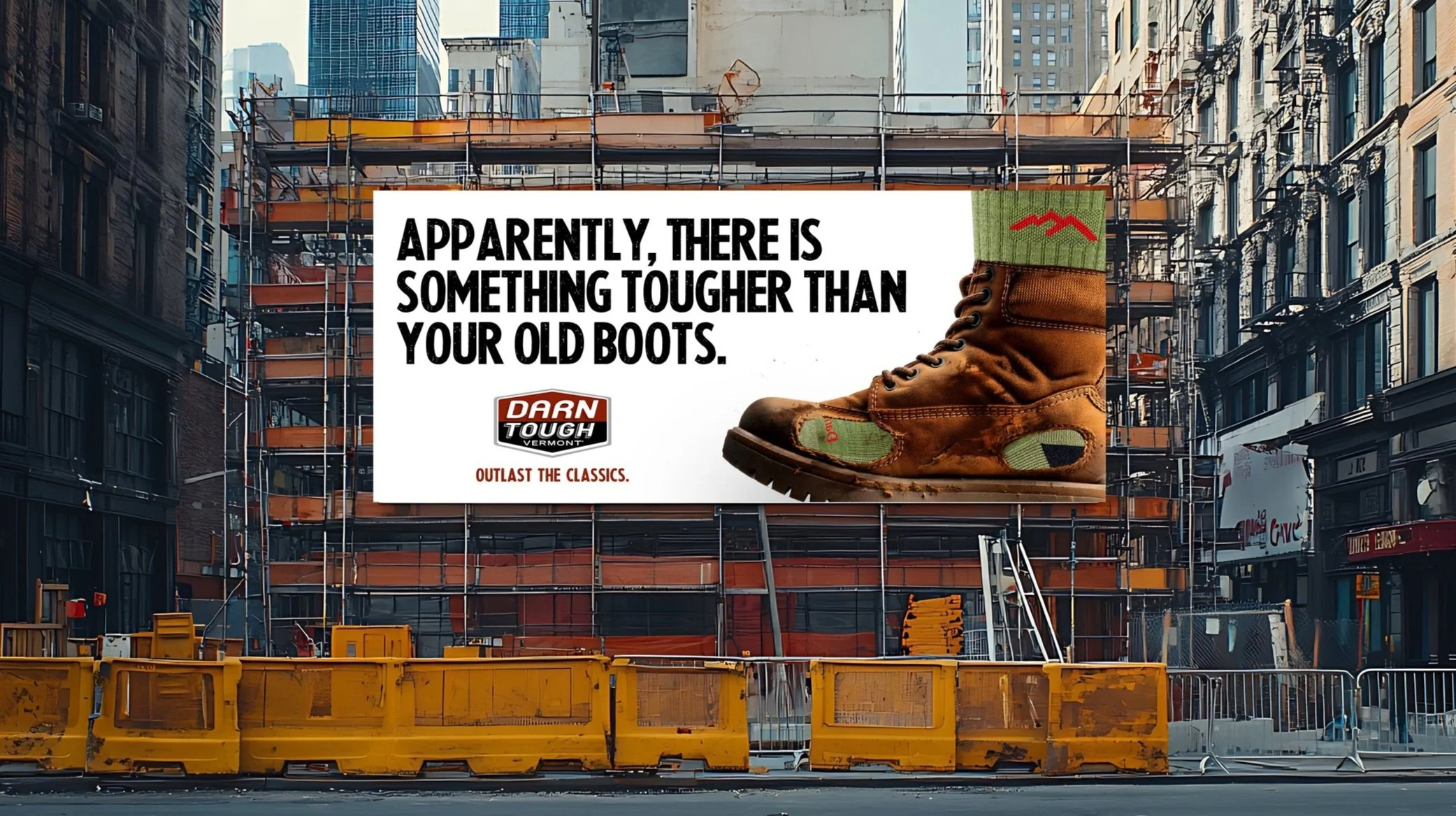 This billboard grabs attention with striking visuals, showcasing torn work boots paired with Darn Tough socks that remain in perfect condition. Positioned at a construction site, the ad highlights how even the most reliable boots can fail, while Darn Tough socks keep going strong, making them the smart choice for any hardworking individual.