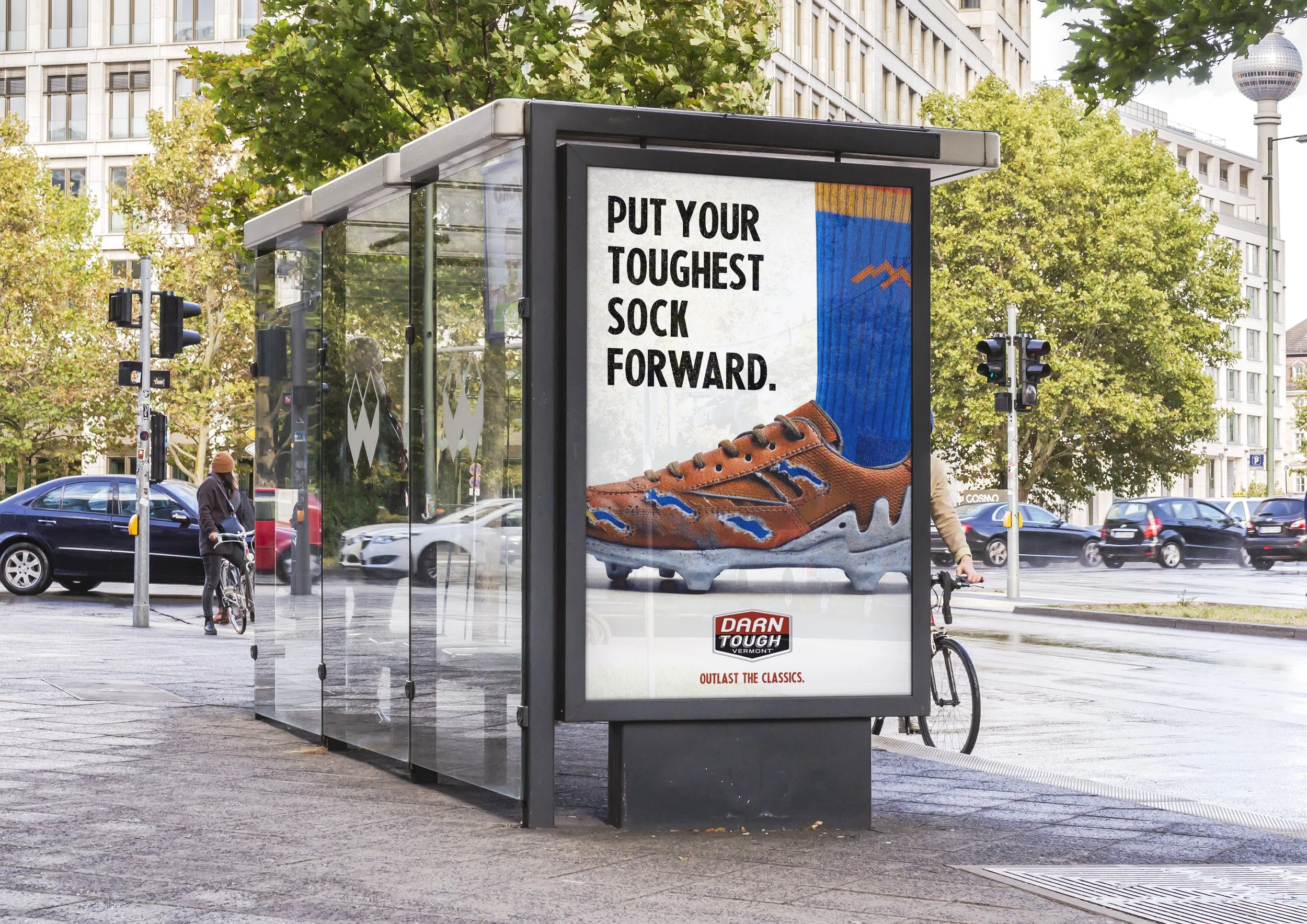 On their daily commute, this campaign grabs attention with the bold headline "Put Your Toughest Sock Forward"—a clever twist on the classic phrase. Paired with striking visuals, it positions Darn Tough as the go-to choice for athletes and everyday consumers alike, proving that real toughness starts from the ground up.